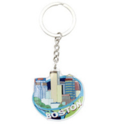 Acrylic keychain featuring Boston Buildings incorporated into a globe-like design.