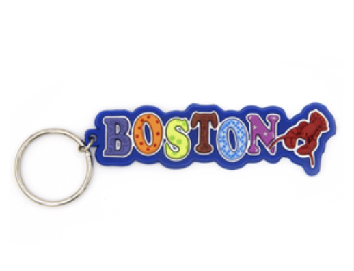 Rubber keychain featuring a multicolor Boston word design and a lobster.