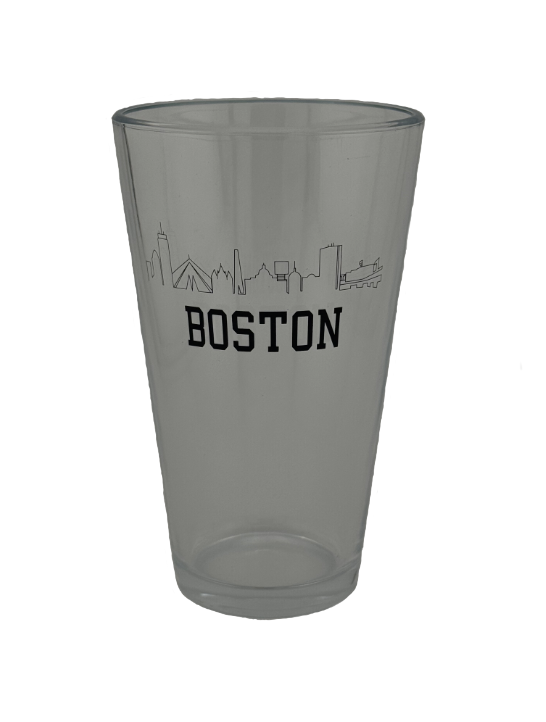 Pint glass featuring a Boston skyline design and black Boston lettering.